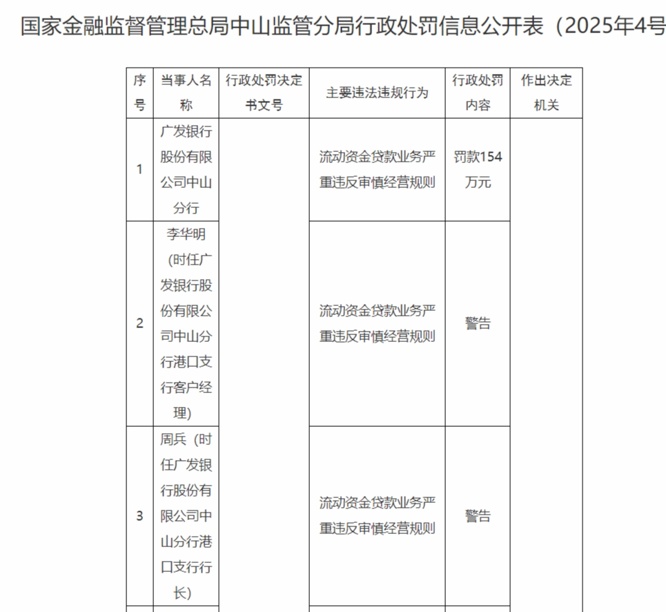 11月5日,国家金融监督管理总局中山监管分局行政处罚信息公开表(2025年4号)显示,广发银行股份有限公司中山分行,流动资金贷款业务严重违反审慎经营规则,被罚款154万元。